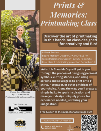 Willard Community Center is honored to announce that it has received a $1,420 grant from the Nebraska Arts Council through the Creative Aging Arts Program. This funding will support our newest class, Prints & Memories: Printmaking, taught by local artist Liz Shea-McCoy.