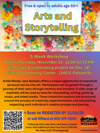 Willard Community Center is excited to offer a brand-new Arts and Storytelling Workshop, a free 5-week program designed for adults age 55 and older. The series begins Thursday, November 13, from 11:00 AM to 12:15 PM, and will culminate in a final class and group project on December 18. All sessions will be held at Willard Community Center, 1245 S. Folsom Street.