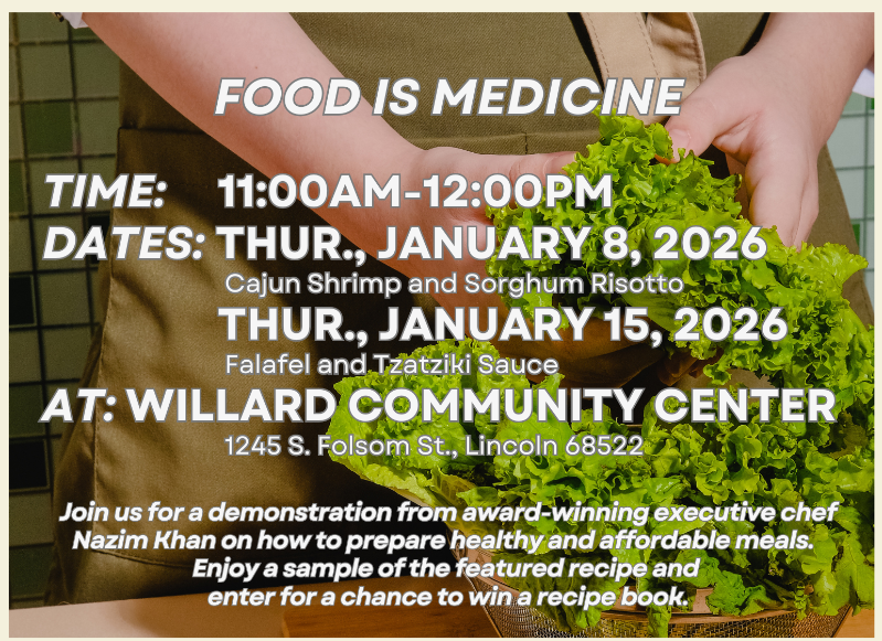 Willard Community Center is excited to welcome the community to Food Is Medicine, a two-part cooking demonstration series designed to show how healthy, affordable meals can support overall wellness. These interactive demonstrations will take place on Thursdays, January 8 and January 15, 2026, from 11:00 a.m. to 12:00 p.m. at Willard Community Center, located at 1245 S. Folsom Street in Lincoln.